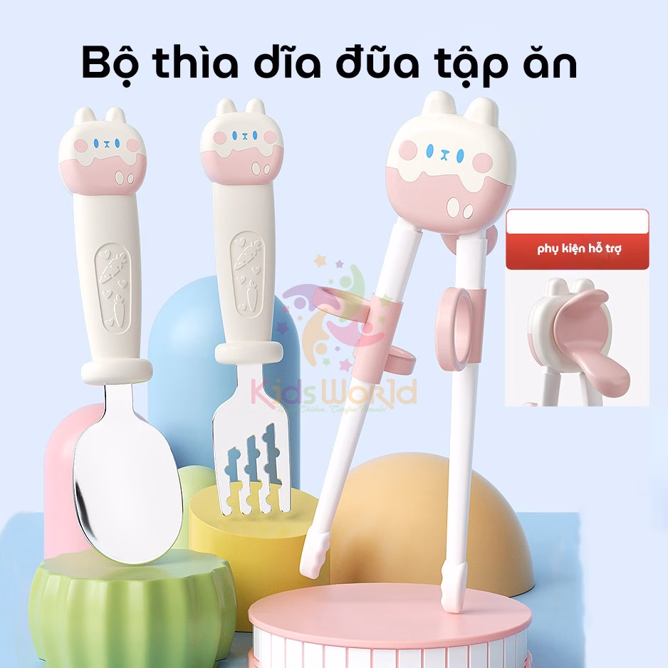 Thứ hai, cha mẹ cần giúp bé quen với việc sử dụng đũa, thìa nĩa. Bộ đũa, thìa nĩa tập ăn thông minh là một công cụ hỗ trợ đắc lực trong quá trình này. Bộ sản phẩm này bao gồm đũa tập gắp xỏ ngón chống trượt, giúp bé dễ dàng cầm nắm và sử dụng.